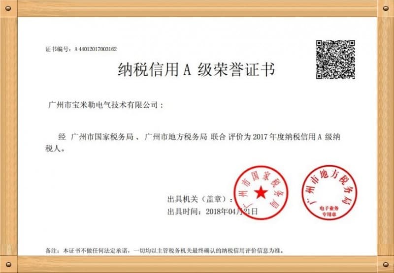 近日,广州市宝米勒电气技术有限公司凭借诚信纳税的良好信誉,被广州市国家税务局、广州市地方税务局联合评定为2017年度纳税信用A级企业,荣获《纳税信用A级荣誉证书》! 据了解,为规范纳税信用管理,评价指标依据国家税务总局《纳税信用评价指标和评价方式(试行)》(2014年第48号公告)进行评分,税务部门依据纳税人信用历史信息、税务内部信息和外部信息等内容对纳税人进行信用评价,按照信用程度设为A、B、C、D四级,其中A级为*优等级。 我司此次获得《纳税信用A级企业证书》,是税务机关对宝米勒变频器税务工作、诚信纳税的肯定。为宝米勒变频器在市场竞争中塑造了良好的企业信誉形象。 今后宝米勒变频器还将继续秉承诚信经营的原则,将继续严格遵从各项税收政策法规,履行企业纳税义务,争取在税企合作方面获得更大荣誉,积极发挥纳税信用A级企业的榜样作用,为促进国家经济发展做贡献。