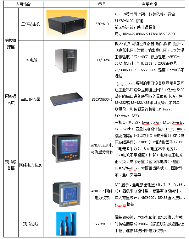 现场设备层设备为133台电力仪表。这些设备分别根据设计要求安装在相应的配电回路上。通过RS-485接口实现与上位机系统的数据交互。多功能表和漏电仪表的通讯规约为Modbus-RTU,保护装置的通讯规约为IEC60870-5-103;通讯管理层由2台Nport-5630串口服务器和1台交换机构成,实际工程中使用了8个485串口,剩下8个串口备用。串口服务器将RS-485总线协议转换为工业以太网协议,通过TCP/IP与站控管理层主机相连,构建数据链路。通讯管理层设备均安装在电气值班室的值班人员操作台中,与站控管理层设备安装在一起; 站控管理层设备为华北工控主机、显示器、HP打印机以及山特UPS电源,均安装在电气值班室的操作台中。通过安装在主机上的Acrel-2000电力监控系统软件实现对现场仪表数据的采集、处理以及各种人机交互功能,具体设备如下表: