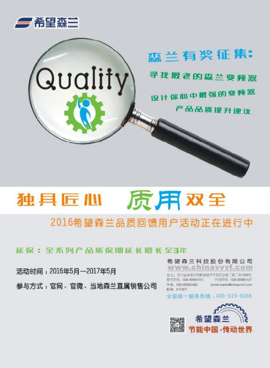 据了解,作为国内变频器行业领军企业的希望森兰科技股份有限公司(以下简称“希望森兰”),在今年的5月份重磅推出了主题为“独具匠心,质用双全”的品质提升回馈活动,目前活动正在火热进行中。