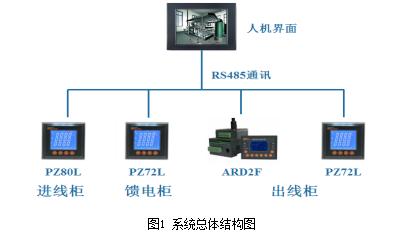 整个系统设备主要包括人机界面、智能仪表PZ72L-E4/KC、PZ80L-E4/KC、电动机保护器ARD2F-100A/CKQ及开关电源,通过屏蔽双绞线将配电柜进线回路、馈线回路、出线回路各个仪表连接至集中采集显示终端,对现场数据的采集、实时显示、参数存盘、故障记录,实现智能型配电柜系统的电力监测管理,系统总体架构如下图1所示。