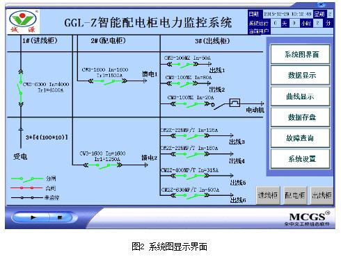 在触摸屏实时显示智能配电柜各个回路用电设备运行状况,便于用于实时了解现场设备状况,对于出现的故障及时处理,并在触摸屏上实现设备的分合闸控制,实现远程遥控操作,系统图显示界面如下图2所示。