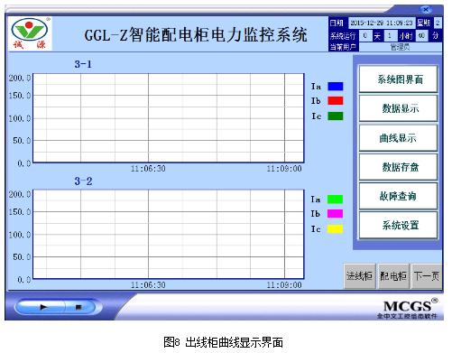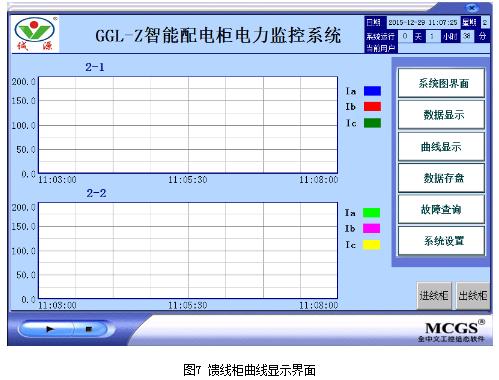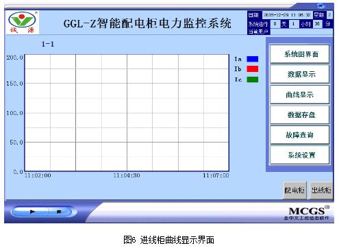电力监控系统将智能配电柜进线回路PZ80L-E4/KC智能仪表、馈线回路PZ72L-E4/KC电测表、出线回路低压电机保护器ARD2F及PZ72L-E4/KC智能电测表[3]的三相电流传给人机界面用曲线的形式表现,为用户提供实时曲线,帮助用户了解设备的用电状况,便于用户实时了解用电设备,具体曲线界面如图6至图8所示。