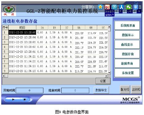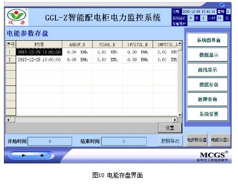 系统采集配电柜进线回路、馈线回路及出线回路各个仪表数据并按照时间段进行历史数据查询,选择时间间隔对系统采集的历史数据精确查询,同时对出线回路电动机运行过程中出现的故障进行实时存盘,查询结果在触摸屏存盘数据浏览构建中显示,便于用户对设备运行参数及运行状况实时了解,同时能实现对数据的导出,便于用于了解各个设备历史运行状况,存盘数据界面如下图9、图10所示。