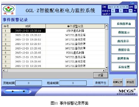 通过触摸屏的遥测对智能配电柜进线回路、馈线回路、出线回路各个设备的电压、电流、功率、频率、功率因数等参数越限及通讯故障实现报警功能,并进行实时记录,便于用户了解现场设备运行参数超过设定值的状况及设备运行状况,事件报警记录界面如下图11所示。