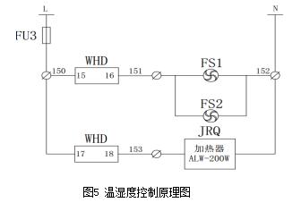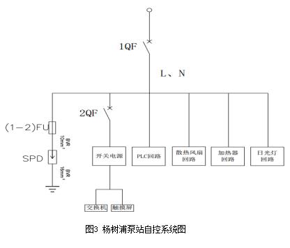 杨树浦泵站自控系统温湿度控制回路由温控器、风扇、加热器组成,温控器的输出触点控制加热器或风扇,当现场控制柜内温度、湿度达到或超过设定的数值,温控器控制加热器或风扇接通电源工作,对控制柜进行加热或鼓风等;一段时间后,控制柜内温度或湿度远离设定值,加热器或风扇停止工作,保证了现场LCU柜内温、湿度的正常,温湿度控制回路原理图如下图所示。