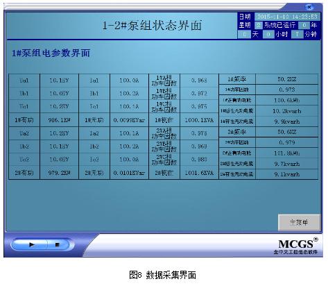 系统主要采集现场电力仪表电流、电压、功率、功率因数、电能等参数,然后通过PLC将参数传送至上位机监控界面实时显示,1#水泵正反转数据采集界面如下。