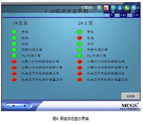 杨树浦泵站自控系统通过PLC控制水泵运行,同时PLC采集水泵的运行状态,包括手动、自动、远方运行指示、电源运行正常指示、开关柜断路器合闸指示等,方便用户实时了解现场水泵运行状况,对出现的故障及时解决处理,状态显示界面如下图所示。