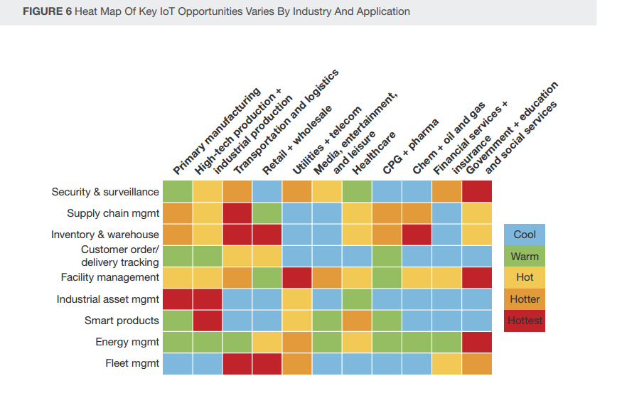 Forrester预测,交通运输、政府部门的安保与监控零售和库存管理以及初级制造业的工业资产管理将是未来物联网增长的热门领域。Forrester还发现,相比小公司,大企业更有可能使用物联网。调查中23%的大型受访企业在使用物联网,中小企业中,这个比例只有14%。