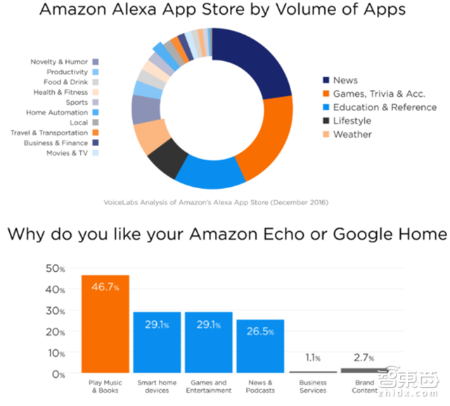 亚马逊的 Alexa 手机 App 和谷歌的 Home手机 App 起到语音应用商店的作用。受到推广的 Alexa 技能,新用户增长率可达 200%,平均每个应用的新增用户数量区间为 500~25 万人。但除此之外,普通用户很难发现新应用(不知道自己可能需要的某项功能已被开发成 Alexa 应用),也较难记住使用频次较低的应用。而除了部分交易型技能(如 Uber、Dominos Pizza)天然具备盈利条件以外,其他技能尚无货币化手段。