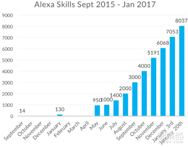 Alexa自去年 8 月起,平均每月新增技能约 1000 个。2017 年 1 月 3 日至 20 日仅 17 天内,新增技能便超过 1000 个,总技能数量已突破 8000 个。内置虚拟助手 Alexa 的基本功能包括点播音乐、询问天气/交通、播报新闻、添加日历行程、购买 Amazon 商品。而通过 Alexa Skill Kit(ASK)的 Alexa 第三方##数量已达到万人级别,可供使用的技能覆盖用户生活的方方面面,包括 Uber 叫车、查询 Capital One 银行账户余额、订 Dominos 披萨、控制 Nest、SmartThings 等智能家居、玩 Jeopardy 游戏等等。