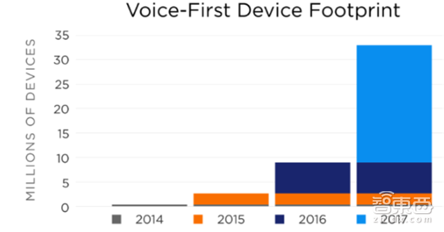 VoiceLabs预计语音优先设备的出货量将从 2015年的 170万和 2016 年的 650 万增长到 2017 年的2450 万。三星、苹果和微软都可能在今年推出自己的语音优先设备。亚马逊今年也将有可能推出一款配备 7寸触摸屏的高端 Echo 智能音箱产品。