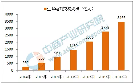生鲜产品作为高频刚需产品,生鲜电商无疑是具有发展潜力的一片蓝海。2015年,我国生鲜电商市场交易规模达到560亿元,并预计2016年将突破900亿元,2017年突破1400亿元,未来几年我国的生鲜电商市场仍会呈快速增长趋势。