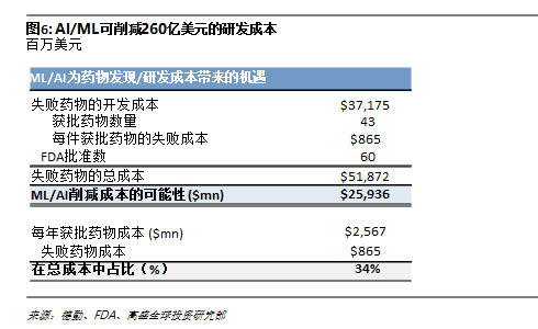 2015年,FDA报告了60种获批药物。这意味着算上失败药物的研发成本,该年度每种获批药物的的成本约为6.98亿美元,其中就有将近420亿美元用在了失败药物上。我们认为,机器学习和人工智能可以将新药研发过程中的风险减半:到2025年,全球制药行业每年即可节省约260亿美元。