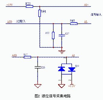 液位信号普遍采集电路如图2所示,当液位传感器为两线制的4-20mA接口时,要求我们的控制器输出一个24VDC电源,安装电阻R22、R45。当液位传感器为三线制的4-20mA接口时,传感器供电由外部开关电源提供,安装电阻R44、R45。当液位传感器为0-10V接口时,安装电阻R44(0Ω)、R45。同理,在液位采集通道处也应加入保护电路。