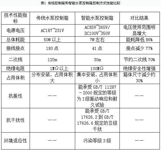 智能型控制器可有效解决传统水泵控制的安全可靠度低、控制箱体尺寸大、能耗高、智能化低、升级难等问题。传统控制箱和智能水泵控制箱体的性能对比如表1所示。