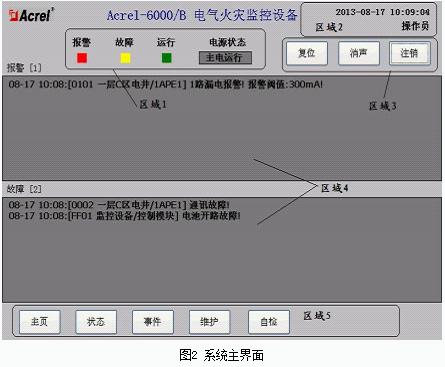 系统主界面显示当前设备的状态,包括运行、故障、报警和电源状态。在正常运行时,故障和报警指示不显示;当监测到有故障、报警发生时,显示故障和报警指示;故障和报警消除后,故障、报警指示自动隐藏;在电源状态栏,显示当前是主电源供电还是备用电源供电。