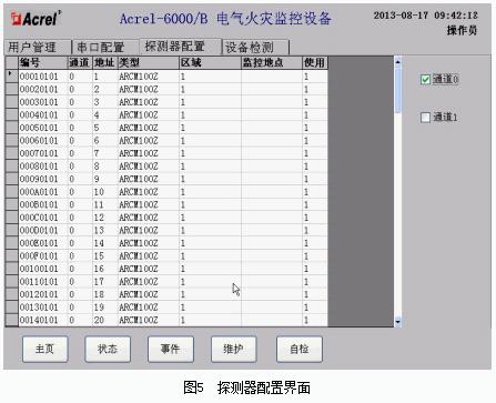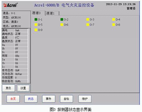 在状态界面中,操作员可以直观的看到所有连接到监控设备的探测器的状态,探测器的状态以颜色进行区分,绿色表示正常,黄色表示故障,红色表示报警。