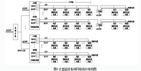 大型建筑或建筑群可采用集中监控主机加多个区域监控主机系统,如图3所示。