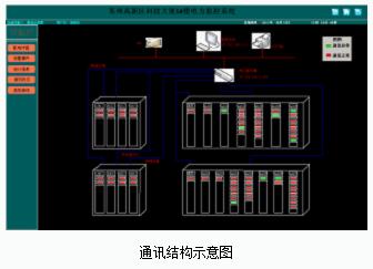 系统通讯结构示意图,主要显示系统的组网结构,系统采用分层分布式结构,同时监测间隔层设备的通信状态。红色表示通讯正常,绿色表示通讯故障。下图为配电所通讯状态示意图。