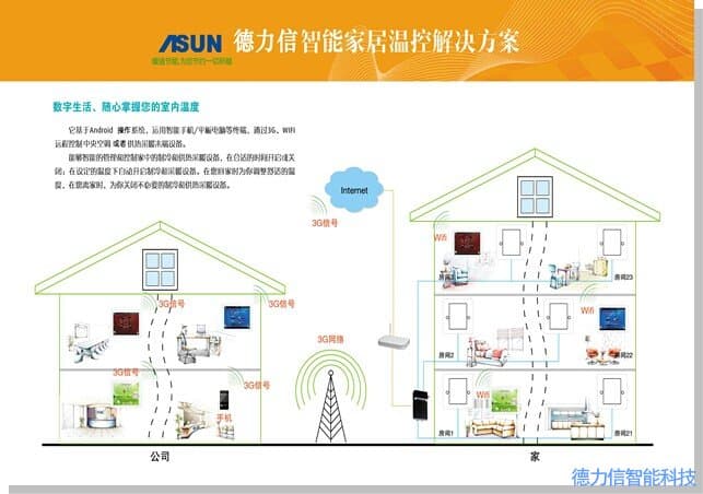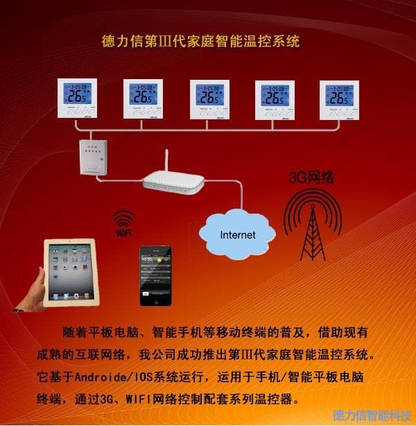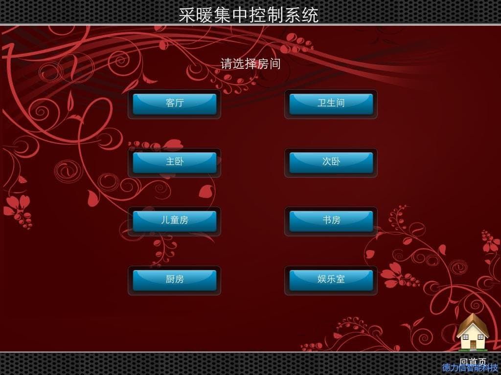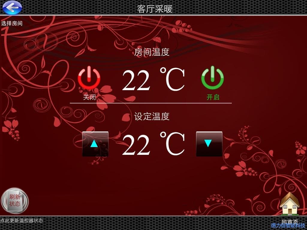 可以通过网络控制末端设备 ●室温校正补偿功能(通过面板按键直接实现) ●采用高可靠性单片机,抗干扰性强 ●具有温度校准功能 ●外壳阻燃材料PC+ABS ●标准86盒表面安装,厚度仅为13mm ●通过安全性和高可靠性测试 ●具有通信功能 · 技术参数 ●感温元件:热敏电阻 ●控温精度:±1℃ ●控温范围: 10~30℃ ●测温范围: 1~50℃ ●电源电压:220V/AC 50HZ ●自耗功率:<1.5W ●外壳材料:PC+ABS(阻燃) ●外形尺寸:86mm×86mm×13mm (高×宽×厚) ●通讯:RS485接口 3、无线路由器 使用无线路由器,需设置网关,用于构建无线网络,进行数据的发送与接收。 4、网络型数据采集器 特点:美国原装进口,产品质量值得信赖; 低功耗,绿色节能环保; 无噪音,保障用户的睡眠质量; 内部绑定域名,高可靠性; 参数: 尺寸:350mm'' x 250mm'' x 140mm'' (长 x 宽 x 深) 供电需求:100-240V,50/60HZ交流电 内存:512 MB DDR3 存储器:512 MB闪存 网络:以太网 5、控制终端(手机或pad平板电脑) 基于 android系统的智能手机,平板电脑 。用户可使用现有的终端或者根据需求购买,从网络主机的特定地址下载软件即可,使用非常方便。 软件模块 n 地暖控制 n 空调控制 通过主机特殊地址正确下载软件之后,点击桌面上的软件可进入主界面(智能家居集中控制系统图) 6、操作说明简约介绍 (智能家居集中控制系统图) 软件的主界面:地暖控制 ,点击相应的图标可以进入到相应的控制界面,以下软件界面为标准界面,可根据用户的平面图设计特定界面。 6.1、地暖控制 点击 地暖控制 ,则进入 地暖控制主界面 ( 采暖集中控制系统图) ( 采暖集中控制系统图) 在地暖控制的主界面上,标注有各个房间的按键,点击即可进入相应房间的地暖控制。 当点开 客厅 按键 ,可进入客厅的地暖控制 (客厅采暖图) (客厅采暖图) 备注: 没有采集到实际温度时,软件显示房间温度与设定温度为22°C |