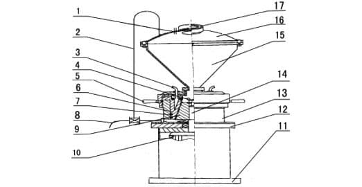 4、接通冷却水后,注入1~2Kg左右的液料或其它与加工物料相关液体,并将湿料保持在经过循环管回流状态。然后才可启动胶体磨,待运转正常后立即投料入胶体磨中加工生产,而可空转式胶体磨亦可免此项。